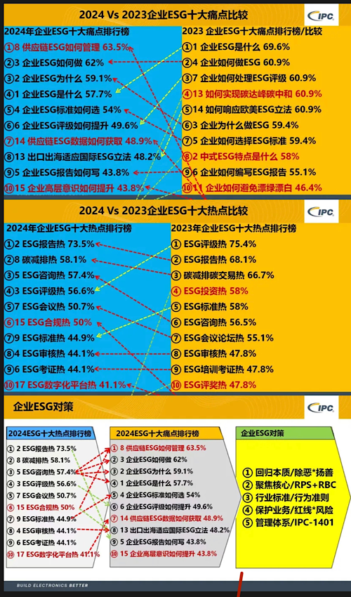 由國際電子工業(yè)聯(lián)接協(xié)會IPC-1401ESG管理體系標準技術(shù)組(以下簡稱“IPC-1401標準技術(shù)組”)發(fā)起,公益時報可持續(xù)發(fā)展研究院等數(shù)十家單位協(xié)辦,“2024企業(yè)ESG十大熱點十大痛點”調(diào)查結(jié)果在上海2024IPC中國電子制造業(yè)年會ESG可持續(xù)發(fā)展論壇正式發(fā)布。“ESG報告熱”位居十大熱點之首,得票率73.5%,從2023年的第二名上升一位。去年熱點第一名“ESG評級熱”下滑至第四名。“供應鏈ESG管理”位居十大痛點之首,得票率63.5%,首次進入前十。2023年痛點第一名“ESG是什么”下滑至第四名。