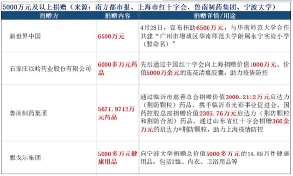 捐贈(zèng)金額在5000萬(wàn)元至1億元(不含)的共四筆,分別是新世界中國(guó)捐助6500萬(wàn)元,以嶺藥業(yè)捐贈(zèng)價(jià)值6000余萬(wàn)元藥品,魯南制藥集團(tuán)捐贈(zèng)價(jià)值5671.9712萬(wàn)元藥品,雅戈?duì)柤瘓F(tuán)捐贈(zèng)價(jià)值5000多萬(wàn)元健康用品。
