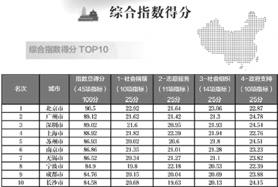 11月5日,中國(guó)慈善聯(lián)合會(huì)在廣州發(fā)布第五屆中國(guó)城市公益慈善指數(shù)。數(shù)據(jù)顯示,2016至2017年間,我國(guó)城市社會(huì)捐贈(zèng)穩(wěn)步增長(zhǎng),社會(huì)組織數(shù)量持續(xù)增加,政府支持力度不斷加大,全國(guó)城市慈善事業(yè)呈現(xiàn)出健康、快速發(fā)展的態(tài)勢(shì)。其中,北京、廣州、深圳、上海、蘇州、南京、無(wú)錫、寧波、成都、長(zhǎng)沙等城市的綜合指數(shù)位居全國(guó)前列。