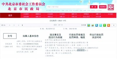 2018年3月2日,北京市民政局對北京中旭公益基金會以未按章程規(guī)定的宗旨和公益活動的業(yè)務(wù)范圍進行活動且情節(jié)嚴(yán)重為由,對其作出撤銷登記的行政處罰(網(wǎng)絡(luò)截圖)
