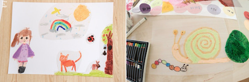 進(jìn)入構(gòu)想與實(shí)踐階段,大家圍繞“春天”展開想象。從野花、山林到微風(fēng)與陽光,那些豐富的自然感受,被逐漸轉(zhuǎn)化為具體的形狀與圖案。創(chuàng)作中,孩子們在透明片上涂繪色彩,觀察疊加帶來的變化,再通過剪紙與拼貼組合畫面,一幅幅充滿童趣的作品逐漸呈現(xiàn)。