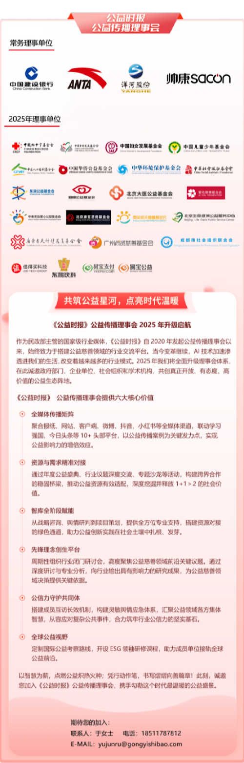 現(xiàn)場,《公益時報》定位于“觀察者”“記錄者”“連接者”,攜手首批二十余位來自基金會、企業(yè)、媒體的伙伴正式發(fā)起“公益守望計劃”2025.旨在與所有公益同行者并肩,共同構(gòu)建更具活力、更可持續(xù)的公益慈善事業(yè)發(fā)展新生態(tài),開啟公益發(fā)展新篇章。
