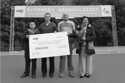2017年3月1日,由嘉吉公司與國際慈善機(jī)構(gòu)國際小母牛組織及其合作伙伴四川?;葜毞?wù)中心共同發(fā)起的一個扶貧項目在四川省青神縣正式啟動。該項目旨在通過支持當(dāng)?shù)剞r(nóng)民養(yǎng)殖肉雞、蛋雞,幫助450個貧困農(nóng)戶增加收入,擺脫貧困,最終實現(xiàn)可持續(xù)發(fā)展。青神縣政府領(lǐng)導(dǎo),嘉吉公司、?;?middot;小母牛組織的高層共同出席了當(dāng)天的雞苗捐贈儀式,八位接受援助的村民代表農(nóng)戶也參與了儀式。
