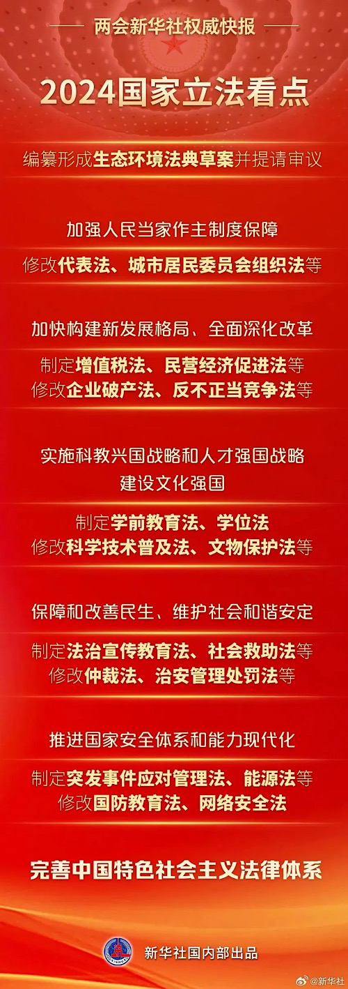 8日提請十四屆全國人大二次會議審議的全國人大常委會工作報告提出,2024年,要認真落實常委會立法規(guī)劃,完善中國特色社會主義法律體系:制定民營經(jīng)濟促進法、學前教育法、社會救助法等,修改城市居民委員會組織法、文物保護法、網(wǎng)絡(luò)安全法等。一起來看↓