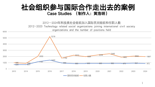 海南亞洲公益研究院提供的一組數(shù)據(jù)表明,國際民間組織數(shù)量從2013年的694家開始,2016年發(fā)展至1423家,達到頂峰,2024年回落至872家。科技類社會組織加入國際民間組織的任職人數(shù),2023年有995人,同樣在2026年沖刺至高點5218人,2024年回落至1987人。這表明,13年間無論是國際民間組織數(shù)量和科技類社會組織加入國際民間組織的任職人數(shù)均達到頂峰后下降,但總體來看趨勢上揚。