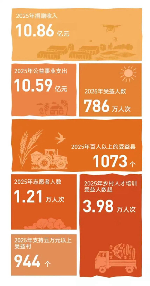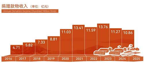最新年報(bào)顯示,鄉(xiāng)基會2025年共接收捐贈款物10.86億元,公益事業(yè)支出10.59億元,均較上一年略有下降。