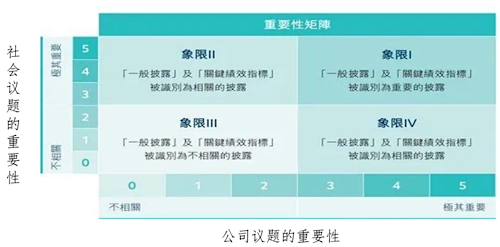 據(jù)介紹,“重要性分析”這一概念由國(guó)際咨詢和標(biāo)準(zhǔn)制定機(jī)構(gòu)AccountAbility于2003年最早提出,強(qiáng)調(diào)重要性的事項(xiàng)分析和信息披露,不是僅僅用于企業(yè)和股東,而是用來(lái)面向主要利益相關(guān)者。2004年聯(lián)合國(guó)全球契約組織推出ESG概念后,英國(guó)石油公司(BP)、美國(guó)福特公司(Ford)和英國(guó)電信公司(BT)等很快把重要性分析矩陣引入了公司的可持續(xù)發(fā)展報(bào)告或ESG報(bào)告之中。