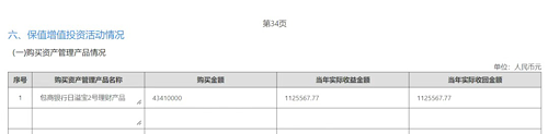 保值增值投資情況方面,年報(bào)顯示,該基金會(huì)購買包商銀行日溢寶2號理財(cái)產(chǎn)品,購買金額4341萬元,當(dāng)年實(shí)際收益1125567.77元。