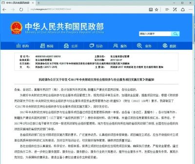 2017年2月7日,民政部辦公廳印發(fā)新一年中央財政支持社會組織參與社會服務(wù)項目的實施方案,今年項目預(yù)算總資金為1.9億元左右