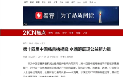 中國青年網(wǎng)將關(guān)注的視角投向本屆慈善榜首度推出的“年度十大慈善項(xiàng)目”,并對獲得此次殊榮之一的“水滴籌”項(xiàng)目所帶來的社會正能量予以了充分肯定。文中說道:“水滴籌此次能夠獲得“年度十大慈善項(xiàng)目”稱號,是中國慈善榜的權(quán)威評委們對水滴籌在推動社會公益救助領(lǐng)域的發(fā)展上所做出貢獻(xiàn)的充分肯定,也是網(wǎng)絡(luò)個(gè)人大病救助平臺首次獲得國內(nèi)公正權(quán)威機(jī)構(gòu)的認(rèn)可。”