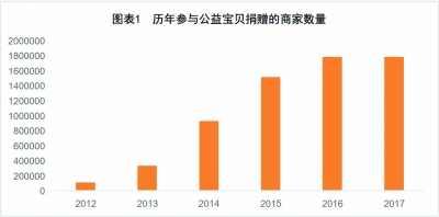 2018年1月8日,阿里研究院發(fā)布阿里巴巴平臺商家公益報(bào)告。2017年,阿里巴巴平臺上產(chǎn)生捐贈的商家高達(dá)178萬家,這一數(shù)字是2012年的16.4倍。2017年,阿里巴巴平臺上參與公益的商家善款總額達(dá)2.46億元,這一數(shù)字是2012年的31倍。2017年,阿里巴巴平臺上捐款超過店鋪總營收金額千分之三的商家,也已達(dá)6.5萬家。