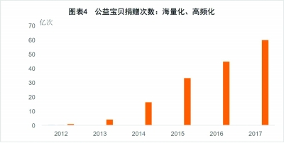 2017年公益寶貝的捐贈次數(shù)達(dá)59.8億次,這一數(shù)字是2012年的72倍之多。從消費(fèi)者角度來看也是如此,2017年有3.5億買家支持了商家的公益行動,人均購買公益相關(guān)的商品17次。