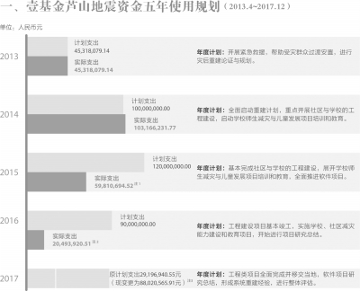 2016年4月20日即將是蘆山地震災(zāi)后恢復(fù)重建的三周年,作為開展災(zāi)后恢復(fù)與重建工作的主要公益組織之一,壹基金發(fā)布了“4·20”蘆山地震三周年工作報(bào)告,向廣大公眾匯報(bào)三年來援助蘆山震后地區(qū)重建工作的主要成果和資金使用情況。截至2016年3月31日,壹基金收到蘆山地震捐款約3.86億元,累計(jì)支出資金2.29億元,已使用資金為全部捐贈(zèng)資金的59.22%,三年里,壹基金與320個(gè)/次伙伴合作,實(shí)施了49個(gè)大型項(xiàng)目,災(zāi)區(qū)受益人次超過40萬。壹基金蘆山地震救援和重建工作基本按照規(guī)劃進(jìn)度有序開展,“以減災(zāi)為核心,創(chuàng)建韌性家園”的災(zāi)后重建工作初見成效。