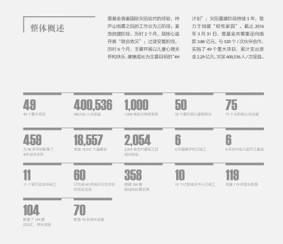 在工作報(bào)告中,壹基金詳細(xì)介紹了三年來災(zāi)后重建取得的各項(xiàng)階段性成果。