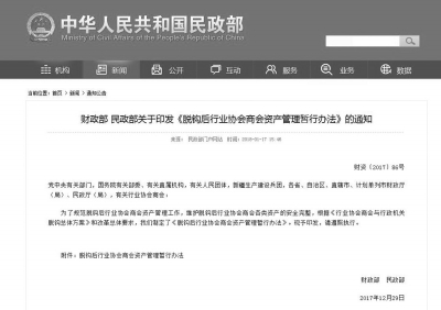 1月17日,民政部網站公布了由財政部、民政部共同印發(fā)的《脫鉤后行業(yè)協會商會資產管理暫行辦法》(以下簡稱《暫行辦法》)。