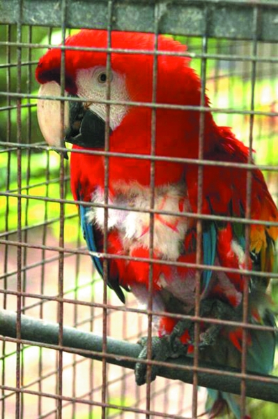 金剛鸚鵡奇卡兩年前被小孩拔了羽毛用繩子在地上拖著當(dāng)“車”玩,鮮血淋漓地被送來,至今腹部羽毛也無法長滿
