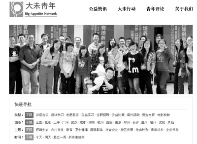 一方面,公益資訊組的成員定期搜集篩選各種公益資訊,包括公益講座、公益活動(dòng)、志愿和就業(yè)機(jī)會(huì)等,這些資訊大多面向新四年人群。每周整理成“公益資訊菜單”,發(fā)布在大未青年的郵件組、網(wǎng)站、微博等各個(gè)渠道。另一方面,每月組織的“聚·大未”線下活動(dòng),是以聚餐、茶話會(huì)、觀影等形式展開(kāi)的小型聚會(huì),每次圍繞一個(gè)選題交流?!拔覀兲峁┑氖且粋€(gè)平臺(tái),將參與公益實(shí)踐的青年聚集到一起,使青年們能收獲友誼,了解資訊,碰撞思維?,F(xiàn)在我們計(jì)劃把大未聚會(huì)的模式推廣到更多地方,建立地區(qū)內(nèi)的公益青年關(guān)系網(wǎng)絡(luò)。”張倩說(shuō)。