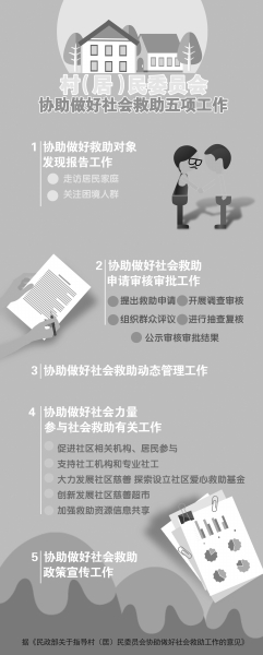 6月初,民政部發(fā)布《關(guān)于指導(dǎo)村(居)民委員會協(xié)助做好社會救助工作的意見》?!兑庖姟诽岢觯笇?dǎo)、督促村(居)民委員會協(xié)助做好社會力量參與社會救助有關(guān)工作,積極促進社區(qū)各類力量參與社會救助,為社會工作服務(wù)機構(gòu)和專業(yè)社會工作者進入社區(qū)創(chuàng)造條件,大力發(fā)展社區(qū)慈善,鼓勵、支持社會組織、企事業(yè)單位和愛心人士等針對困境家庭和救助對象開展慈善救助,加強社區(qū)救助資源信息共享。 困難群眾在社區(qū) 《意見》指出,困難群眾居住在社區(qū)、生活在社區(qū)、服務(wù)依托社區(qū),因此健全完善社會救助經(jīng)辦服務(wù)體系,落實好各項社會救助政策,不斷提升基層社會救助服務(wù)水平,真正為困難群眾排憂解難,離不開村(居)民委員會的參與、協(xié)助和配合。 社會救助與社區(qū)居民利益息息相關(guān),是社區(qū)公共服務(wù)不可或缺的重要方面,同時村(居)民委員會也最了解困難群眾的生活狀況和救助需求。 《意見》強調(diào),各級民政部門要指導(dǎo)村(居)民委員會根據(jù)轄區(qū)幅度、人口規(guī)模等因素,安排必要的人員協(xié)助做好社會救助工作。切實加強經(jīng)費保障,將村(居)民委員會協(xié)助做好社會救助工作所需經(jīng)費納入社會救助工作經(jīng)費統(tǒng)籌考慮,并按照“費隨事轉(zhuǎn)”原則,適當給予經(jīng)費補助。要加強社會救助管理信息系統(tǒng)與社區(qū)綜合信息管理服務(wù)平臺的對接,實現(xiàn)社會救助對象數(shù)據(jù)和社區(qū)居民數(shù)據(jù)統(tǒng)一采集、多方共享。各級民政部門要有針對性地加強培訓(xùn)工作,確保村(居)民委員會相關(guān)工作人員熟悉、掌握社會救助政策與社會工作專業(yè)理念、方法和技巧。 《意見》還要求抓緊研究政府購買社會救助服務(wù)的機制、路徑和辦法,不斷創(chuàng)新村(居)民委員會協(xié)助做好社會救助工作的模式、方法。探索將社會組織引入社會救助,逐步拓展社會救助服務(wù)內(nèi)涵,積極指導(dǎo)村(居)民委員會以社區(qū)為平臺,統(tǒng)籌整合政府救助、慈善救助和社會服務(wù)等資源,實施形式多樣的救助服務(wù),最大程度滿足困難群眾的救助需求。 協(xié)助做好救助對象發(fā)現(xiàn)報告工作 在民政部門的指導(dǎo)下,村(居)民委員會在社會救助方面要協(xié)助完成哪些工作呢? 首先,救助對象的發(fā)現(xiàn)報告工作責無旁貸。 《意見》提出,村(居)民委員會應(yīng)該將發(fā)現(xiàn)排查困難群眾列為日常重點工作,安排社區(qū)工作者、專業(yè)社會工作者、志愿者等經(jīng)常性走訪居民家庭,了解、收集困難群眾的現(xiàn)狀信息,掌握、核實轄區(qū)內(nèi)居民生活困難及遭遇突發(fā)事件、意外事故、罹患重病等急難情況,并及時告知鄉(xiāng)鎮(zhèn)人民政府(街道辦事處)。指導(dǎo)、督促村(居)民委員會在日常工作中,將轄區(qū)內(nèi)的留守兒童、獨居老人、殘疾人、重病患者等易陷入生活困境的人群作為重點,開展經(jīng)常性走訪、問候;關(guān)注居住在本轄區(qū)的外來人員,幫助有困難的家庭和個人提出救助申請。指導(dǎo)有條件的村(居)民委員會在社區(qū)公共服務(wù)場所開設(shè)救助咨詢服務(wù)窗口,開通救助服務(wù)熱線,方便困難群眾求助。 協(xié)助申請審核審批工作 一是協(xié)助提出救助申請。指導(dǎo)、督促村(居)民委員會接受申請最低生活保障、特困人員供養(yǎng)、醫(yī)療救助、教育救助、住房救助、臨時救助等社會救助的有困難的家庭或個人的委托,代其向鄉(xiāng)鎮(zhèn)人民政府(街道辦事處)或相關(guān)救助機構(gòu)提交書面申請及材料。指導(dǎo)、督促村(居)民委員會將申請人所有申請材料全部上交,不得自行做出不予受理或不符合救助條件的決定。要指導(dǎo)、督促村(居)民委員會成員及其他社區(qū)工作者主動申報備案其近親屬申請救助的情況。 二是協(xié)助開展調(diào)查審核。指導(dǎo)、督促村(居)民委員會協(xié)助鄉(xiāng)鎮(zhèn)人民政府(街道辦事處),組織駐村(社區(qū))干部、社區(qū)救助專干、專業(yè)社會工作者等工作人員,通過入戶調(diào)查、鄰里訪問等形式,對社會救助申請人聲明的家庭經(jīng)濟狀況、人口狀況、遭遇困難類型等逐一調(diào)查核實,并由調(diào)查人員和申請人簽字確認。調(diào)查審核的責任主體是鄉(xiāng)鎮(zhèn)人民政府(街道辦事處),村(居)民委員會不能自行做出調(diào)查審核結(jié)論。 三是協(xié)助組織群眾評議。指導(dǎo)、督促村(居)民委員會在入戶調(diào)查結(jié)束后,協(xié)助鄉(xiāng)鎮(zhèn)人民政府(街道辦事處)組織村(居)民代表或者群眾評議小組對救助申請人聲明的家庭收入、財產(chǎn)狀況以及入戶調(diào)查結(jié)果的客觀性、真實性和完整性進行評議。 四是協(xié)助進行抽查復(fù)核。縣級民政部門要在村(居)民委員會的參與下開展抽查復(fù)核工作,全面、準確地聽取村(居)民委員會關(guān)于入戶調(diào)查、鄰里訪問、群眾評議以及村(居)民委員會成員等社區(qū)工作人員近親屬申請救助備案等情況介紹。有條件的地方,縣級民政部門可邀請鄉(xiāng)鎮(zhèn)人民政府(街道辦事處)、村(居)民委員會參與審批。 五是協(xié)助公示審核