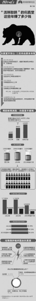 “2014年總營業(yè)額為1.7億,熊膽粉系列就占到了1.57億,這個(gè)數(shù)字讓我很吃驚,熊膽粉來自800多頭熊,還有一部分小熊,這樣可以計(jì)算出每頭熊一年賺多少錢。根據(jù)我們了解,每只熊一年產(chǎn)量大約是3公斤熊膽粉,用1.57億除以800再除以3就能得出每只熊每年的熊膽價(jià)格近65000元,這還包括各種包裝及銷售渠道成本,如此高的利潤業(yè)績值得考證?!睆埿『1硎尽?/p>