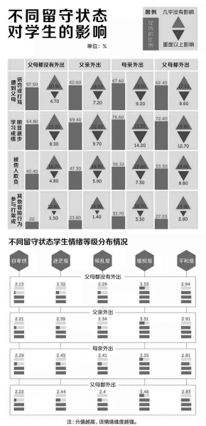 ■ 本報(bào)記者 王勇 2020年1月,北京上學(xué)路上公益促進(jìn)中心發(fā)布了《2019年度中國(guó)留守兒童心靈狀況白皮書》?!栋灼返年P(guān)鍵詞為“教·養(yǎng)”,從對(duì)留守兒童本身的調(diào)查研究,延伸到了他們身后的父母、家庭、校園、朋友。 據(jù)了解,2019白皮書研究報(bào)告從2019年3月啟動(dòng),歷時(shí)10個(gè)月,涉及15個(gè)省、自治區(qū)、直轄市,問卷樣本總數(shù)為14000份。與此前4年的白皮書報(bào)告的調(diào)查過程不同,2019年的調(diào)查首次實(shí)施面對(duì)面訪談,留守家庭入戶家訪地區(qū)涉及河南省洛陽市嵩縣、安徽省六安市獅子崗鄉(xiāng)、甘肅省平?jīng)鍪嗅轻紖^(qū)、云南省騰沖市騰越鎮(zhèn)四個(gè)地區(qū),共計(jì)入戶探訪超100個(gè)留守家庭。 《白皮書》對(duì)江西、安徽和云南三省2763份實(shí)證數(shù)據(jù)進(jìn)行分析。數(shù)據(jù)表明,調(diào)查地區(qū)兒童遭受暴力對(duì)待主要分為軀體遭受暴力對(duì)待、精神遭受暴力對(duì)待、性遭受暴力對(duì)待和忽視四類,發(fā)生率分別達(dá)到65.1%、91.3%、30.6%和40.6%。值得關(guān)注的是,這其中有13.7%的兒童遭受四重暴力。 親子分離和隔代教養(yǎng)產(chǎn)生較大影響 據(jù)民政部公布的數(shù)據(jù),2018年,全國(guó)共有農(nóng)村留守兒童697萬余人,96%的農(nóng)村留守兒童由祖父母或者外祖父母照顧。 由于父母雙方或一方不在身邊,留守兒童多由祖輩進(jìn)行照顧,這種養(yǎng)育方式也導(dǎo)致留守兒童在教育和成長(zhǎng)過程中呈現(xiàn)出“親子分離”和“隔代教養(yǎng)”的特征。 通過對(duì)農(nóng)村非留守兒童、農(nóng)村留守兒、農(nóng)民工隨遷子女三類兒童的數(shù)據(jù)比較,研究發(fā)現(xiàn)親子分離和隔代教養(yǎng)對(duì)兒童的親子互動(dòng)形式、教育方式等產(chǎn)生明顯的影響,對(duì)于兒童的心理發(fā)展、行為養(yǎng)成等社會(huì)化過程會(huì)產(chǎn)生較大影響。 從親子互動(dòng)形式上看,看護(hù)人擁抱撫摸孩子以及與孩子說笑玩耍情況方面,留守兒童和非留守兒童相似,低于隨遷子女家庭情況。從親子互動(dòng)內(nèi)容上看,與孩子聊有興趣的東西情況,留守兒童低于非留守兒童,遠(yuǎn)低于隨遷子女。與孩子聊每天過得怎么樣,留守兒童明顯低于非留守兒童,低于隨遷子女。 在親子日?;?dòng)上,留守兒童很少和父母一起吃飯,非留守兒童和隨遷子女較多,85%的兒童至少每天一次。此外,留守兒童和非留守兒童很少和父母一起做活動(dòng),隨遷子女兒童最高。 在親子外出休閑上,隨遷子女外出頻率較多,農(nóng)村留守兒童少于非留守兒童。帶孩子參觀博物館、聽音樂會(huì)、聽?wèi)蚍矫?,留守兒童少于非留守,二者均遠(yuǎn)低于隨遷子女。 再者,三類兒童在教育方式上同樣出現(xiàn)明顯差異,留守兒童的看護(hù)人較少與孩子討論學(xué)習(xí)狀況,給孩子的信息少。 此外,三類兒童在教育資源上有明顯差異: 55.3%的留守兒童所在的學(xué)校沒有圖書館、而非留守兒童和隨遷子女在此方面的比例為46.2%、28%。 62.3%的留守兒童所在的學(xué)校沒有計(jì)算機(jī)房、而非留守兒童和隨遷子女在此方面的比例為50.9%、27.6%。 47.5%的留守兒童父母不知道孩子的班主任是誰、而非留守兒童和隨遷子女在此方面的比例為37.4%、18.4%。 中國(guó)勞動(dòng)關(guān)系學(xué)院社會(huì)工作學(xué)院副教授葉鵬飛建議,在農(nóng)村中建立社會(huì)工作站,從各個(gè)方面對(duì)留守兒童教育和成長(zhǎng)發(fā)揮積極影響。比如建立農(nóng)村留守兒童的教育支持小組,通過來自組員和朋友之間的關(guān)愛、傾訴來提供支持,緩解他們對(duì)于父母的思念,疏解負(fù)面情緒等。 但目前農(nóng)村社會(huì)工作仍比較滯后,農(nóng)村社會(huì)組織培育存在不足。 遭受暴力對(duì)待問題不容忽視 此次《白皮書》披露的兒童遭受暴力對(duì)待的問題同樣不容忽視。 2019年,《白皮書》對(duì)江西、安徽和云南三省2763份實(shí)證數(shù)據(jù)進(jìn)行分析。數(shù)據(jù)表明,調(diào)查地區(qū)兒童遭受暴力對(duì)待主要分為軀體遭受暴力對(duì)待、精神遭受暴力對(duì)待、性遭受暴力對(duì)待和忽視四類,發(fā)生率分別達(dá)到65.1%、91.3%、30.6%和40.6%。值得關(guān)注的是,這其中有13.7%的兒童遭受四重暴力。 對(duì)于軀體暴力和精神暴力,家庭和學(xué)校是發(fā)生的兩個(gè)主要場(chǎng)所。其中,軀體暴力主要發(fā)生在學(xué)校中,這表明校園欺凌,包括老師的體罰和學(xué)生之間的欺凌,成為兒童暴力的“重災(zāi)區(qū)”,精神暴力主要發(fā)生在家庭領(lǐng)域中,留守兒童遭受辱罵、歧視等精神暴力最多,其發(fā)生率達(dá)到86%以上,具有一定的普遍性。 《白皮書》對(duì)遭受暴力對(duì)待后兒童心理發(fā)展進(jìn)行的均值分析表明,遭受暴力對(duì)待對(duì)兒童心理發(fā)展具有負(fù)面影響。整體上,受到暴力對(duì)待后兒童自尊、抗逆力、情緒力和社交力均有下降,下降幅度最高可達(dá)到10.6%。 值得注意的是,與以往研究結(jié)果不同,本次調(diào)查結(jié)果分析表示,城市兒童遭受暴力無論在強(qiáng)度還是廣度都要高于農(nóng)村兒童,尤其在家庭軀體暴力、學(xué)校精神暴力、忽視和性暴力方面,表明城市同