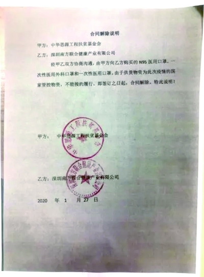 ■ 本報(bào)記者 張明敏 1月29日,因沒有達(dá)成執(zhí)行意向,湖北省紅十字基金會(huì)向中華思源工程扶貧基金會(huì)(以下簡(jiǎn)稱“思源工程”)退還1900余萬元善款,并在微博發(fā)布付款回單。但隨即有網(wǎng)友指出,該付款回單上,收款人開戶行中的“支行”被誤寫作“之行”,且退還金額少了20萬元。 此外,有網(wǎng)友質(zhì)疑,思源工程在1月26日通過微博發(fā)布的防控物資采購公告中,所示的供貨方并不具備醫(yī)療口罩生產(chǎn)資質(zhì)。此外,思源工程2014年至2018年的五年累計(jì)捐贈(zèng)收入比公益支出多出1.83億元,這筆余款的使用也引人關(guān)注。 1月31日,《公益時(shí)報(bào)》記者聯(lián)系思源工程副秘書長(zhǎng)陶鳴,對(duì)這些質(zhì)疑進(jìn)行了回應(yīng)。 合同公示期 未撥付任何資金 陶鳴在接受《公益時(shí)報(bào)》記者采訪時(shí)表示:“向深圳南方聯(lián)合健康產(chǎn)業(yè)有限公司采購口罩一事屬實(shí),該微博發(fā)布的采購合同尚在公示期,只是意向性購買,并未達(dá)成實(shí)質(zhì)性購買,所以僅有思源工程一方蓋章。公示期內(nèi)并未向?qū)Ψ街Ц抖ń鸹驌芨度魏慰铐?xiàng)?!?/p> 對(duì)于網(wǎng)友提出供貨商深圳南方聯(lián)合健康產(chǎn)業(yè)有限公司供應(yīng)資質(zhì)的問題,思源工程方面給記者傳來了幾張?jiān)摴镜馁Y質(zhì)圖片,包括營(yíng)業(yè)執(zhí)照、醫(yī)療器械經(jīng)營(yíng)許可證、二類醫(yī)療器械經(jīng)營(yíng)備案憑證等。 有網(wǎng)友稱,曾致電深圳南方聯(lián)合健康產(chǎn)業(yè)有限公司求證向思源工程供貨一事,得到答復(fù)為“從未賣口罩給基金會(huì)”。《公益時(shí)報(bào)》記者通過“天眼查”查詢到該公司負(fù)責(zé)人電話,但撥打后均被掛斷。 根據(jù)天眼查顯示,南方聯(lián)合健康產(chǎn)業(yè)有限公司經(jīng)營(yíng)項(xiàng)目為“健康產(chǎn)業(yè)投資(具體項(xiàng)目另行申報(bào));醫(yī)療設(shè)備的租賃、上門維護(hù)以及技術(shù)開發(fā);一類醫(yī)療器械的購銷及其它國(guó)內(nèi)貿(mào)易(法律、行政法規(guī)、國(guó)務(wù)院決定規(guī)定在登記前須經(jīng)批準(zhǔn)的項(xiàng)目除外);興辦實(shí)業(yè)(具體項(xiàng)目另行申報(bào));經(jīng)營(yíng)進(jìn)出口業(yè)務(wù)。(法律、行政法規(guī)、國(guó)務(wù)院決定禁止的項(xiàng)目除外,限制的項(xiàng)目須取得許可后方可經(jīng)營(yíng))。許可經(jīng)營(yíng)項(xiàng)目是:經(jīng)營(yíng)醫(yī)療器械的銷售(按醫(yī)療器械經(jīng)營(yíng)企業(yè)許可證的審批項(xiàng)目經(jīng)營(yíng))。” 國(guó)家統(tǒng)籌調(diào)配資源 合同已取消 陶鳴表示,思源工程從武漢市衛(wèi)健委獲知需求信息后,1月26日,在詢價(jià)、談判期間,一方面要求深圳南方聯(lián)合健康產(chǎn)業(yè)有限公司提供采購協(xié)議(注明型號(hào)、數(shù)量、單價(jià)、總價(jià))等信息,并在網(wǎng)上公示;另一方面立即派員趕往口罩生產(chǎn)地去核實(shí)標(biāo)準(zhǔn)、數(shù)量等事宜,公示期間思源工程并未支付定金或撥付任何款項(xiàng)。 由于思源工程采購的GB19083-2010標(biāo)準(zhǔn)N95口罩需求量大,春節(jié)期間第一時(shí)間要供貨,很難聯(lián)系上滿足符合標(biāo)準(zhǔn)和條件的生產(chǎn)廠、供貨商。多方聯(lián)系后,深圳南方聯(lián)合健康產(chǎn)業(yè)有限公司表示可以供應(yīng)GB19083-2010標(biāo)準(zhǔn)的N95醫(yī)用口罩,價(jià)格為14元/個(gè)。 陶鳴說,在采購合同的詢價(jià)、談判公示階段,有網(wǎng)友對(duì)GB19083-2010標(biāo)準(zhǔn)的N95醫(yī)用口罩的價(jià)格有意見,為尊重網(wǎng)友意見,思源工程開始向社會(huì)各界征集價(jià)格更低的GB19083-2010標(biāo)準(zhǔn)N95口罩的相關(guān)信息。 1月26日,根據(jù)中央應(yīng)對(duì)新型冠狀病毒感染肺炎疫情工作領(lǐng)導(dǎo)小組會(huì)議精神,“調(diào)配全國(guó)資源,優(yōu)先保障湖北省和武漢市急需的醫(yī)護(hù)力量和醫(yī)療物資”,深圳南方聯(lián)合健康產(chǎn)業(yè)有限公司不能如期供貨,便取消了合同。 思源工程向《公益時(shí)報(bào)》出示了一份落款蓋章為1月27日深圳南方聯(lián)合健康產(chǎn)業(yè)有限公司的聲明函,該函件稱1月26日,國(guó)務(wù)院會(huì)議針對(duì)武漢疫情做出重要批示,特強(qiáng)調(diào)由國(guó)家統(tǒng)籌調(diào)配全國(guó)資源,現(xiàn)醫(yī)用口罩屬于國(guó)家管控類產(chǎn)品,導(dǎo)致不能如期供貨,請(qǐng)給與理解,再次感謝愛心人士和貴單位認(rèn)可。 思源工程方面隨后又出示了一份與深圳南方聯(lián)合健康產(chǎn)業(yè)有限公司于1月27日簽署合同解除說明。表示甲方向乙方購買的供貨物資為此次疫情的國(guó)家管控物資,不能按約履行,即簽訂之日起,合同解除。 陶鳴說:“現(xiàn)根據(jù)中央應(yīng)對(duì)新型冠狀病毒感染肺炎疫情工作領(lǐng)導(dǎo)小組會(huì)議精神,‘調(diào)配全國(guó)資源,優(yōu)先保障湖北省和武漢市急需的醫(yī)護(hù)力量和醫(yī)療物資’,深圳南方聯(lián)合健康產(chǎn)業(yè)有限公司不能如期供貨,現(xiàn)合同取消。” 基金會(huì)收到退回的20萬捐款 1月29日,湖北省紅十字基金會(huì)公布了一張銀行付款電子回執(zhí)單據(jù)引發(fā)關(gu