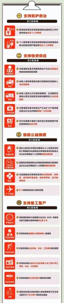 新的《指引》增加了新政,細(xì)化了內(nèi)容,補(bǔ)充了清單,共涉及支持防護(hù)救治、支持物資供應(yīng)、鼓勵(lì)公益捐贈、支持復(fù)工復(fù)產(chǎn)四個(gè)方面17條措施。