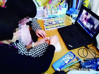 針對(duì)武漢市心智障礙兒童在疫情期間無(wú)法持續(xù)進(jìn)行康復(fù)訓(xùn)練和特殊教育等問(wèn)題,愛(ài)特中心發(fā)起了“云端有愛(ài),線上無(wú)礙”項(xiàng)目。圖為孩子在家長(zhǎng)陪伴下接受一對(duì)一線上康復(fù)指導(dǎo)課程