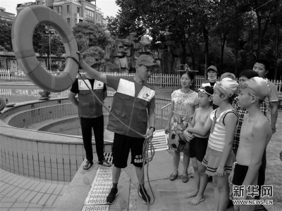 長興縣紅十字會應急救援人員教授如何用救生圈救溺水者。浙江省湖州市長興縣雉城街道在水木花都社區(qū)開展“暑期防溺水教育進社區(qū)”主題活動,用通俗易懂的方式在轄區(qū)的幼兒園、小學等開展溺水救援知識教學,把相關應急救援知識教給孩子和家長,為孩子們的暑期生活護航。