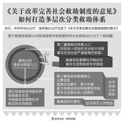 ■ 本報記者 王勇 近日,中共中央辦公廳、國務(wù)院辦公廳印發(fā)了《關(guān)于改革完善社會救助制度的意見》(以下簡稱《意見》)。民政部有關(guān)負(fù)責(zé)人就貫徹落實《意見》有關(guān)問題回答了記者的提問。民政部將會同有關(guān)部門采取有效措施,積極推動《意見》貫徹落實。 社會救助發(fā)展不平衡不充分 社會救助事關(guān)困難群眾基本生活和衣食冷暖,關(guān)系民生、連著民心,是社會建設(shè)的兜底性、基礎(chǔ)性工作。黨的十八大以來,以習(xí)近平同志為核心的黨中央對社會救助工作作出一系列重大部署,2014年國務(wù)院頒布《社會救助暫行辦法》,確立了以最低生活保障、特困人員供養(yǎng)、受災(zāi)人員救助、醫(yī)療救助、教育救助、住房救助、就業(yè)救助、臨時救助為主體,社會力量參與為補充的“8+1”社會救助制度框架。各地區(qū)、各有關(guān)部門相應(yīng)出臺配套政策,不斷完善制度體系、健全體制機制,使社會救助在保障基本民生、打贏脫貧攻堅戰(zhàn)、全面建成小康社會等方面發(fā)揮了重要作用。每年有近5000萬困難群眾得到基本生活救助,實施臨時救助1000多萬人次。近5年來,我國城市和農(nóng)村低保標(biāo)準(zhǔn)年均分別增長8.7%和14%。各專項救助也取得明顯成效。 但是,與新時代困難群眾對美好生活的向往相比,社會救助發(fā)展不平衡不充分的問題仍然較為突出。比如,一些救助政策和保障措施只覆蓋特困人員、低保對象;制度之間協(xié)調(diào)聯(lián)動不夠,救助資源分散,救助信息不能互通共享,兜底保障安全網(wǎng)不夠嚴(yán)密;救助方式和供給主體單一,難以滿足困難群眾多樣化救助需求;一些地方投入不足,基層經(jīng)辦服務(wù)能力薄弱等。這些問題影響了困難群眾的獲得感、幸福感、安全感,是當(dāng)前基本民生兜底保障工作的短板和弱項。黨的十九大提出統(tǒng)籌城鄉(xiāng)社會救助體系,完善最低生活保障制度;黨的十九屆四中全會要求統(tǒng)籌完善社會救助制度,注重加強普惠性、基礎(chǔ)性、兜底性民生建設(shè),保障群眾基本生活,這為新時代改革完善社會救助制度指明了方向。《意見》正是在這樣的背景下制定出臺的。 ?;?、兜底線、救急難、可持續(xù) 《意見》以習(xí)近平新時代中國特色社會主義思想為指導(dǎo),全面貫徹黨的十九大和十九屆二中、三中、四中全會精神,堅持問題導(dǎo)向、目標(biāo)導(dǎo)向、效果導(dǎo)向相結(jié)合,按照保基本、兜底線、救急難、可持續(xù)的總體思路,提出了兜底保障基本民生的綜合改革舉措,是引領(lǐng)新時代社會救助事業(yè)高質(zhì)量發(fā)展的重要指導(dǎo)性文件,確定的目標(biāo)原則和改革任務(wù)充分考慮了未來一個時期我國社會救助制度的發(fā)展趨勢及時代要求。 一是有效銜接扶貧開發(fā)政策,確保2020年打贏脫貧攻堅戰(zhàn),為完全喪失勞動能力和部分喪失勞動能力且依靠產(chǎn)業(yè)就業(yè)幫扶無法脫貧的困難群眾提供兜底保障,鞏固脫貧攻堅成果;二是堅持問題導(dǎo)向,在兜底線、織密網(wǎng)、建機制上完善政策制度,形成基本民生保障長效機制;三是根據(jù)新時代我國社會主要矛盾已經(jīng)轉(zhuǎn)化的實際,聚焦特殊群體,回應(yīng)群眾關(guān)切,增強社會救助的精準(zhǔn)識別和反應(yīng)能力,使有需要的困難群眾都能得到及時救助;四是適應(yīng)我國經(jīng)濟發(fā)展新常態(tài),科學(xué)確定救助標(biāo)準(zhǔn)和水平。 按照上述思路,《意見》以統(tǒng)籌救助資源、增強兜底功能、提升服務(wù)能力為重點,提出了一攬子改革措施。主要內(nèi)容分為三個部分。第一部分是總體要求,提出新時代我國社會救助發(fā)展的指導(dǎo)思想、基本原則和總體目標(biāo)。第二部分是改革完善社會救助制度的重點任務(wù),分別從建立分層分類的社會救助體系、夯實基本生活救助、健全專項社會救助、完善急難社會救助、促進(jìn)社會力量參與、深化“放管服”改革等方面提出一系列具體改革措施。第三部分從加強組織領(lǐng)導(dǎo)、落實部門責(zé)任、提高基層服務(wù)能力、加強監(jiān)督檢查等方面明確落實《意見》的保障措施。 七方面創(chuàng)新 《意見》以統(tǒng)籌救助資源、增強兜底功能、提升服務(wù)能力為重點,在政策設(shè)計和制度安排上有不少創(chuàng)新舉措,最突出的有以下幾個方面: 一是構(gòu)建綜合救助格局。《意見》要求加快構(gòu)建政府主導(dǎo)、社會參與、制度健全、政策銜接、兜底有力的綜合救助格局。以基本生活救助、專項社會救助、急難社會救助為主體,社會力量參與為補充,建立健全分層分類的救助制度體系,實現(xiàn)精準(zhǔn)救助、高效救助、溫暖救助、智慧救助。 二是打造多層次分類救助體系?!兑庖姟犯鶕?jù)困難群眾的困難程度和致困原因?qū)⑸鐣戎鷦澐譃槿齻€救助圈:最核心的是絕對貧困人口,通過低?;蛘咛乩ЧB(yǎng)保障基本生活,并根據(jù)實際需要給予相應(yīng)的醫(yī)療、住房、教育、就業(yè)等專項救助;第二圈是相對貧困人口(即低收入和剛性支出較大導(dǎo)致基本生活出現(xiàn)嚴(yán)重困難的家庭),根據(jù)實際需要給予相應(yīng)的基本生活救助或醫(yī)療、住房、教育、就業(yè)等專項救助;第三圈是其