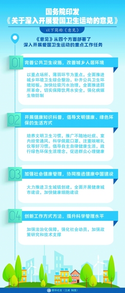 ■ 本報記者 王勇 為深入貫徹習(xí)近平總書記關(guān)于愛國衛(wèi)生工作的重要指示精神,落實黨中央、國務(wù)院決策部署,繼承和發(fā)揚愛國衛(wèi)生運動優(yōu)良傳統(tǒng),充分發(fā)揮愛國衛(wèi)生運動的制度優(yōu)勢、組織優(yōu)勢、文化優(yōu)勢和群眾優(yōu)勢,將愛國衛(wèi)生運動與傳染病、慢性病防控等緊密結(jié)合,全面改善人居環(huán)境,加快形成文明健康、綠色環(huán)保的生活方式,有效保障人民群眾健康,11月27日,國務(wù)院印發(fā)的《關(guān)于深入開展愛國衛(wèi)生運動的意見》對外公布。 《意見》提出的總體目標(biāo)是:公共衛(wèi)生設(shè)施不斷完善,城鄉(xiāng)環(huán)境面貌全面改善,文明健康、綠色環(huán)保的生活方式廣泛普及,衛(wèi)生城鎮(zhèn)覆蓋率持續(xù)提升,健康城市建設(shè)深入推進,健康細胞建設(shè)廣泛開展,愛祖國、講衛(wèi)生、樹文明、重健康的濃厚文化氛圍普遍形成,愛國衛(wèi)生運動傳統(tǒng)深入全民,從部門到地方、從社會到個人、的整體聯(lián)動新格局基本建立,社會健康綜合治理能力全面提高。 《意見》提出,要通過政府購買服務(wù)等方式,支持社會組織、專業(yè)社會工作者和志愿者積極參與。 改善城鄉(xiāng)人居環(huán)境 《意見》提出,要完善公共衛(wèi)生設(shè)施,改善城鄉(xiāng)人居環(huán)境。 一是推進城鄉(xiāng)環(huán)境衛(wèi)生綜合整治。以重點場所、薄弱環(huán)節(jié)為重點,全面推進城鄉(xiāng)環(huán)境衛(wèi)生綜合整治,建立健全環(huán)境衛(wèi)生管理長效機制,補齊公共衛(wèi)生環(huán)境短板。推進農(nóng)貿(mào)市場合理布局和標(biāo)準(zhǔn)化建設(shè),規(guī)范市場功能分區(qū)設(shè)置,逐步取消市場活禽交易,維護好市場及周邊環(huán)境衛(wèi)生。加強小餐飲店、小作坊等食品生產(chǎn)經(jīng)營場所環(huán)境衛(wèi)生整治,推進餐飲業(yè)“明廚亮灶”。持續(xù)抓好城市老舊小區(qū)、城中村、城鄉(xiāng)結(jié)合部、背街小巷、建筑工地等環(huán)境衛(wèi)生管理。推進村莊清潔行動,深入持久開展農(nóng)村人居環(huán)境整治。加強大氣、水、土壤污染治理,嚴(yán)格實行污染物排放總量控制,嚴(yán)厲打擊違法排污行為。逐步建立環(huán)境與健康調(diào)查、監(jiān)測和風(fēng)險評估制度,定期開展城鄉(xiāng)環(huán)境衛(wèi)生狀況評價。 二是加快垃圾污水治理。加強城市生活垃圾和污水處理設(shè)施建設(shè),做好生活垃圾分類投放、分類收集、分類運輸、分類處理,逐步實現(xiàn)城市生活垃圾減量化和資源化、無害化處理。通過政策鼓勵、宣傳教育等,引導(dǎo)群眾主動參與垃圾分類。持續(xù)推進縣域生活垃圾和污水統(tǒng)籌治理,有條件的地方垃圾污水處理設(shè)施和服務(wù)向農(nóng)村延伸。因地制宜加強農(nóng)村生活污水處理設(shè)施建設(shè),確保污水不亂排。建立完善農(nóng)村垃圾收運處置體系,開展垃圾源頭減量、就地分類和資源化利用。積極開展農(nóng)業(yè)面源污染治理,推進農(nóng)藥化肥減量增效、農(nóng)膜回收利用、畜禽糞污和農(nóng)作物秸稈資源化利用。加快醫(yī)療廢物處置設(shè)施建設(shè),完善醫(yī)療廢物和污水處理。 三是全面推進廁所革命。扎實推進農(nóng)村戶用衛(wèi)生廁所建設(shè)改造,引導(dǎo)農(nóng)村新建住房配套建設(shè)衛(wèi)生廁所,人口規(guī)模較大村莊配套建設(shè)公共衛(wèi)生廁所,強化管理維護,逐步擴大廁所糞污無害化處理和資源化利用覆蓋面。推進學(xué)校廁所改造建設(shè),提升規(guī)范化衛(wèi)生管理水平,抓好糞污無害化處理。深入推進旅游廁所提檔升級,提升管理維護水平。大力開展農(nóng)貿(mào)市場、醫(yī)療衛(wèi)生機構(gòu)、客運站等重點公共場所廁所環(huán)境整治,有效改善廁所環(huán)境衛(wèi)生狀況。 四是切實保障飲用水安全。依法嚴(yán)格飲用水水源保護區(qū)管理。完善水源保護、自來水生產(chǎn)、安全供水全過程監(jiān)管體系,加強對飲用水水源、水廠供水和用水點的水質(zhì)監(jiān)測。推進規(guī)?;┧こ探ㄔO(shè)以及人口分散區(qū)域的小型供水工程規(guī)范化改造,不斷提高農(nóng)村供水保障水平。加快城市供水設(shè)施建設(shè)改造,提高供水能力,擴大供水范圍。加強城市二次供水規(guī)范化管理。 五是強化病媒生物防制。健全病媒生物監(jiān)測網(wǎng)絡(luò),加強病媒生物監(jiān)測,發(fā)生傳染病疫情時增加監(jiān)測頻率、擴大監(jiān)測范圍,及時掌握病媒生物密度、種屬和孳生情況,科學(xué)制定防制方案。堅持日常防制和集中防制、專業(yè)防制和常規(guī)防制相結(jié)合,積極開展以環(huán)境治理為主、藥物防制為輔的病媒生物防制工作。消除病媒生物孳生環(huán)境,切斷傳染病傳播途徑,有效防控登革熱、寨卡病毒病等媒介傳染病。強化病媒消殺隊伍建設(shè),提升病媒生物防制能力。 倡導(dǎo)健康的生活方式 《意見》提出,要開展健康知識科普,倡導(dǎo)文明健康、綠色環(huán)保的生活方式。 一是培養(yǎng)文明衛(wèi)生習(xí)慣。廣泛開展健康科普進村鎮(zhèn)、進社區(qū)、進機關(guān)、進企業(yè)、進學(xué)校、進家庭活動,宣傳公共衛(wèi)生安全、重大疾病防控及不同季節(jié)重