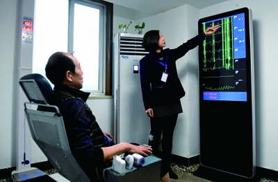 洛陽(yáng)市英才社區(qū)智慧養(yǎng)老服務(wù)中心的工作人員在為老人講解儀器檢測(cè)得出的各項(xiàng)身體情況數(shù)值(新華社記者 李安/攝)