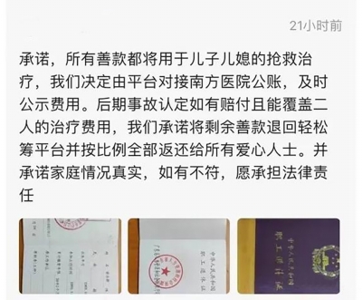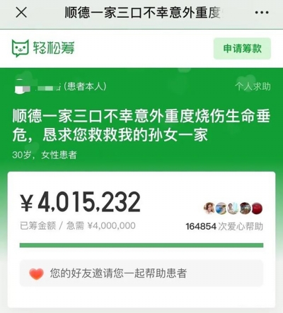 兩家人、同一車出行,不料遭遇汽車起火意外事故。日前,廣東佛山兩條來自輕松籌的籌款鏈接很快吸引數(shù)十萬人捐款,兩個遭遇不測的家庭600萬元的籌資目標(biāo)迅速完成。 在大家接力“慷慨解囊”的同時,一些質(zhì)疑的聲音也開始出現(xiàn)。對此,記者采訪當(dāng)事人家屬及平臺,對這一事件進行調(diào)查。 兩家人同車出行 遭遇意外事故被燒傷 8月9日晚,一條名為“順德一家三口不幸意外重度燒傷生命垂危,懇求您救救我孫女一家”的第三方籌款鏈接,刷爆了廣東省佛山市順德區(qū)的市民朋友圈。 “看著可愛的孫女躺在病床上奄奄一息的樣子,我的心就像被刀切碎了一樣?!卑l(fā)起求助的,是其中一位女性傷者的父親。 這位父親稱,今年8月8日中午1時,女兒一家在乘車中突然意外遭遇火災(zāi)造成特重度燒傷,隨后送到了醫(yī)院搶救。 求助鏈接放上了其女兒、女兒丈夫及孫女的燒傷治療照。病床上的傷者全身包裹著繃帶。鏈接上,發(fā)起求助者還公布了一家人的傷情,并曬出了醫(yī)院相關(guān)診斷書。其女兒何某全身多處特重度燒傷90%,孫女全身多處特重度燒傷85%,其女婿梁某則是頭部、四肢重度燒傷40%,傷情嚴重。 值得關(guān)注的是,在鏈接發(fā)出后當(dāng)晚,數(shù)小時400萬元款項就籌集完畢。 同車遭遇意外燒傷的還有另一家人。第二天(8月10日)傍晚,這一家人的籌資救助的鏈接也開始出現(xiàn)在市民的朋友圈上。據(jù)悉,其籌資目標(biāo)為200萬元。 發(fā)起救助的是傷者之一的父親。他稱,其兒子一家與另一家是“開著借用的車”出行,隨后突然出現(xiàn)意外(交警和消防正在調(diào)查起火事故原因)。“僅僅幾秒鐘時間車廂里滿是火焰,兒子到第三排抱著我的小孫女拖著兒媳下車,孫女在爸爸的保護下面部、手臂和腿部也均有輕度燒傷,但夫妻兩人卻被大火包圍造成重度燒傷,所乘車輛也被燒成了空架子?!?/p> 鏈接上,求助者也放出了一家的救治照片,附上了診斷證明。據(jù)悉,這一家男性傷者徐某全身各處重度燒傷50%,其妻子盧某全身重度燒傷30%。而經(jīng)過一晚上,200萬元善款也籌資完成。 關(guān)于家庭財產(chǎn) “我說得實事求是” 接連兩天,佛山全社會為兩個家庭共籌資超過600萬元。記者了解到,在大家接力“慷慨解囊”的同時,關(guān)于傷者家庭真實情況等一些質(zhì)疑的聲音開始出現(xiàn)。 針對質(zhì)疑,10日,輕松籌平臺上更新了一份關(guān)于傷者家庭財產(chǎn)情況的證明。記者看到,在證明文末的一行“經(jīng)核實,該家庭為我社區(qū)非低保家庭,非低保臨界家庭”手寫字樣上,蓋上了傷者梁某所在居委會印章。 證明還提及了傷者梁某夫妻在北滘坤洲開設(shè)一間加工作坊,有一幢自建房,有一臺小轎車等。 對此,記者也第一時間就該份證明向蓋章單位進行核實。據(jù)其所在的碧江村委會相關(guān)負責(zé)人介紹,該證明確實是經(jīng)居委會之手。 8月11日,記者找到了遭遇事故家庭之一傷者梁某的親哥哥。他回應(yīng)稱,對于網(wǎng)上提及的一些質(zhì)疑聲音,自己實話實說,“光明正大”。 “我弟弟的情況全都是真實的?!绷耗车母绺邕€表示,關(guān)于一些質(zhì)疑的聲音,自己暫時無暇顧及。當(dāng)務(wù)之急要籌資救人,讓家人脫離危險?!俺霈F(xiàn)這樣的變故,誰都不愿意接受。” 關(guān)于治療費用 “做好了賣房的準(zhǔn)備” 梁某的哥哥透露,當(dāng)前弟弟一家暫未脫離生命危險。近段時間來,除安撫、陪伴傷者家庭,他還奔走在保險公司、社保部門等,爭取更多權(quán)益。 因為不在急救第一現(xiàn)場,梁某哥哥表示對上眾籌平臺一事了解不多,但也就緣何籌資400萬元進行了回應(yīng)。 他稱,據(jù)收治其弟媳的廣州市紅十字會醫(yī)院給出的治療方案,全部治療費用“保底”也要200萬元?!暗艿芎椭杜谀戏结t(yī)院,現(xiàn)在還沒脫離危險期,醫(yī)院表示還無法給出具體的治療費用。但是我坦誠說,400萬元肯定是不夠的。” “我們已經(jīng)做好準(zhǔn)備了,將全部身家都拿出來,用來救人?!绷耗掣绺缁貞?yīng)記者,一家人已經(jīng)做好了“最壞打算”?!耙劝盐业艿姆孔淤u了,如果還不夠的話,就把我爸的一個房子拿出來賣了,現(xiàn)在已經(jīng)做好這樣的準(zhǔn)備了。”他還表示,目前一家人也在等待事故原因的查明。 該籌款鏈接也發(fā)出了新的籌款動態(tài)。其中上傳了三名患者費用診斷證明,表示前期合計320萬元費用缺口。 平臺回應(yīng) 已觸發(fā)“風(fēng)控機制” 在眾籌過程中,不少網(wǎng)友也對平臺提出質(zhì)疑,包括材料審核、籌款修改等。 8月10日,輕松籌平臺經(jīng)過內(nèi)部調(diào)查,并通過采訪函回復(fù)記者,此次順德燒傷家庭的籌款事宜,是輕松籌籌款顧問在醫(yī)院遇到了發(fā)起人,在發(fā)起人表達對籌款有需求后,其對項目發(fā)起的步驟及所需材料進行了輔導(dǎo)。 那么,在該起求助信息中,平臺對于求助人的傷情,以及家庭背景做了哪些調(diào)查工作? 平臺表示,根據(jù)《自律公約2.0》的規(guī)定,平臺要求發(fā)起人按平臺規(guī)定,提交發(fā)起人及求助人身份信息、醫(yī)療機構(gòu)開具的醫(yī)療證明等真實材料,并對材料進行形式審核。平臺嚴格按照《自律公約》執(zhí)行。另外,平臺積極與求助人進行溝通,提供必要的蓋章證明材料。 平臺