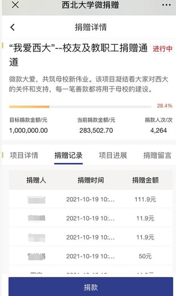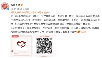 近日,西北大學(xué)官方微博發(fā)出的一則募捐倡議引發(fā)網(wǎng)友熱議。 今年,西北大學(xué)迎來建校119周年。該校校友總會號召校友、老師及學(xué)生,每月捐出一杯奶茶或一杯豆?jié){的錢,支持母校發(fā)展。 倡議發(fā)出后,引來網(wǎng)友調(diào)侃西北大學(xué)是“中國最窮211”。 10月18日,西北大學(xué)工作人員回應(yīng)稱,校友捐贈是大學(xué)經(jīng)費的來源之一,很多大學(xué)都有這種渠道?!拔覀兪窃诜煽蚣芟逻M行的,錢款的使用都會公示?!?/p> 募捐“一杯奶茶的錢” 10月14日,西北大學(xué)官方微博發(fā)布一則捐贈倡議。該校校友總會對校友、老師及在校學(xué)生發(fā)出號召:在每月的6~9日將一杯奶茶(11.9元)或一杯豆?jié){(1.19元)的錢節(jié)省下來支持母校發(fā)展建設(shè),或者也可捐贈任意金額,并在文字下方配有捐贈二維碼圖片。 倡議發(fā)出后,引來不少圍觀。對此,有網(wǎng)友表示“大為震驚”,并寫道“不是說缺一杯奶茶錢豆?jié){錢……倡議捐錢是長久之計嗎”。也有人認(rèn)為,“雖然我也捐了,希望學(xué)校也越來越好,但是我覺得這個行為多多少少有點……” 其中也不乏網(wǎng)友調(diào)侃,“捐了,不要讓我沒學(xué)上”“俺們是真的樸”“中國最窮211,心酸,淚目”。 多的留言則是為西北大學(xué)“哭窮”:“在校到畢業(yè),感覺西大一直挺大方。這次雖說是倡議,但這樣伸手,看來真的缺錢了吧,救救西大”“太慘了太慘了……” 撞名美國著名的西北大學(xué),我國西北大學(xué)盡管實力不凡,卻顯得“不太知名”。實際上,擁有119年歷史的西北大學(xué)是我國西北地區(qū)辦學(xué)歷史最為悠久的高等學(xué)府。 官方簡介顯示,西北大學(xué)現(xiàn)為首批國家“世界一流學(xué)科建設(shè)高?!薄摇?11工程”建設(shè)院校、教育部與陜西省共建高校。 在2017年的第四輪學(xué)科評估中,該校有2個學(xué)科進入A類,16個學(xué)科進入前30%,學(xué)科整體實力和水平較第三輪學(xué)科評估有了較大提升。地球科學(xué)、材料科學(xué)、化學(xué)、工程學(xué)、臨床醫(yī)學(xué)、藥理學(xué)與毒理學(xué)等學(xué)科還進入ESI全球前1%行列。 中國“最窮”211? 由校友總會發(fā)起的一項募捐活動也許不代表西北大學(xué)校方試圖以這種方式獲得“大力支持”。但這并不妨礙網(wǎng)友們“借題發(fā)揮”,為西北大學(xué)“實慘”的經(jīng)費現(xiàn)狀而賣力“哭窮”。 當(dāng)前,陜西省共有8所“雙一流”高校,其中3所“一流大學(xué)建設(shè)高?!?,即西安交通大學(xué)、西北工業(yè)大學(xué)、西北農(nóng)林科技大學(xué);5所“一流學(xué)科建設(shè)高校”,即西北大學(xué)、西安電子科技大學(xué)、長安大學(xué)、陜西師范大學(xué)、第四軍醫(yī)大學(xué)。 西北大學(xué)則是8所中唯一一所省屬高校,這成為影響其經(jīng)費來源的重要因素。 同在陜西的教育部直屬高校西交大、工信部直屬高校西工大的2021年經(jīng)費預(yù)算已躋身百億。其他4所陜西部屬“雙一流”——西電、西農(nóng)、長大、陜師大的預(yù)算總經(jīng)費分別為51.78億元、45.55億元、35.71億元、31.87億元。 作為陜西省屬高校,西北大學(xué)的預(yù)算經(jīng)費為14.18億元,和上面幾所高校相去甚遠(yuǎn)。而這一數(shù)字已相較去年增加了5.73億,增長百分比高達(dá)67.8%。 在東西部之間、西部區(qū)域省份內(nèi)的高校經(jīng)費差距更加明顯。 2021年,同樣位于西部的四川省10所地方高校預(yù)算收入均超過10億元。再以省屬頭部高校為例,蘇州大學(xué)預(yù)算收入32.84億元,成都大學(xué)為24.3億元。 經(jīng)費捉襟見肘,西北大學(xué)產(chǎn)出卻不低。 據(jù)西北大學(xué)校長郭立宏透露,該校投入產(chǎn)出比位居全國高校前列。西北大學(xué)辦學(xué)經(jīng)費投入位列95所一流學(xué)科建設(shè)高校中下游,高層次人才引育成效和科研產(chǎn)出則分列第8和第24位。 西北大學(xué)官微在一篇題為《西北大學(xué)2020年十大新聞》的文章披露,2020年,該校獲批國家級哲學(xué)社會科學(xué)科研項目41項,其中重大重點項目8項;教育部人文社科項目20項;獲批國家自然科學(xué)基金135項,其中重大重點項目6項,獲批國家重點研發(fā)計劃課題8項;科研到款經(jīng)費3.58億元,其中理工類縱向項目到款2.26億元,創(chuàng)歷史新高。 2021年8月,西北大學(xué)公布2021年度國家自然科學(xué)基金項目申請結(jié)果。在申報的各類項目579項,共有144項項目獲得資助,獲批直接經(jīng)費6944萬元,項目資助率24.87%,超過基金委平均資助率8個百分點。獲批項目數(shù)較上年同期增長9.92%。 高校校友“高額”捐贈 那么,西北大學(xué)校友總會發(fā)出的募捐是否真的顯“寒酸”? 其實,我國其他高校校友會也曾發(fā)出類似的倡議,數(shù)額也并不高。 比如,北京大學(xué)校友會今年7月對該校2021屆畢業(yè)生發(fā)起的倡議以支持北大的一項公益種子計劃,倡議捐贈額從1.23元起、或捐贈123元,可獲得相應(yīng)捐贈紀(jì)念品。 復(fù)旦大學(xué)則會在每年建校周年紀(jì)念日發(fā)起年度捐贈。以2021年為例,復(fù)旦建校116年,該校校友會倡導(dǎo)以116元的倍數(shù)進行(116,232,348……以此類推),所有捐贈將注入復(fù)旦大學(xué)校友基金,以支持復(fù)旦大學(xué)發(f