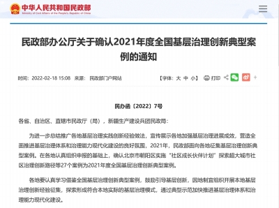 為進(jìn)一步總結(jié)推廣各地基層治理實(shí)踐創(chuàng)新經(jīng)驗(yàn)做法,宣傳展示各地加強(qiáng)基層治理進(jìn)展成效,營造全面推進(jìn)基層治理體系和治理能力現(xiàn)代化建設(shè)的良好氛圍,2021年,民政部面向各地征集基層治理創(chuàng)新典型案例。在各地認(rèn)真組織申報(bào)的基礎(chǔ)上,確認(rèn)北京市朝陽區(qū)實(shí)施“社區(qū)成長(zhǎng)伙伴計(jì)劃”探索超大城市社區(qū)治理創(chuàng)新路徑等27個(gè)案例為2021年度全國基層治理創(chuàng)新典型案例。 各地要認(rèn)真學(xué)習(xí)借鑒全國基層治理創(chuàng)新典型案例,鼓勵(lì)引導(dǎo)基層創(chuàng)新,因地制宜組織開展本地基層治理創(chuàng)新經(jīng)驗(yàn)征集,探索形成符合本地實(shí)際的基層治理模式,通過典型示范加快推進(jìn)基層治理體系和治理能力現(xiàn)代化建設(shè)。 以下為2021年度全國基層治理創(chuàng)新典型案例名單: 1.北京市朝陽區(qū):實(shí)施“社區(qū)成長(zhǎng)伙伴計(jì)劃”探索超大城市社區(qū)治理創(chuàng)新路徑 2.北京市昌平區(qū):實(shí)施公共服務(wù)設(shè)施提升三年行動(dòng)計(jì)劃破解回天地區(qū)治理難題 3.吉林省琿春市:聚力攻堅(jiān)打造專業(yè)化職業(yè)化社區(qū)工作者隊(duì)伍 4.上海市浦東新區(qū):建設(shè)“家門口”服務(wù)體系“繡”出高品質(zhì)社區(qū)服務(wù) 5.江蘇省南京市鼓樓區(qū):以居民滿意度考評(píng)機(jī)制推動(dòng)街道服務(wù)管理再創(chuàng)新 6.江蘇省無錫市新吳區(qū)旺莊街道:實(shí)施“益動(dòng)旺莊”成長(zhǎng)計(jì)劃探索社區(qū)工作者階梯式培養(yǎng)新模式 7.浙江省杭州市西湖區(qū):以民生綜合體打造社區(qū)服務(wù)體系建設(shè)新樣本 8.浙江省麗水市蓮都區(qū):陽光票決制助推農(nóng)村社區(qū)治理創(chuàng)新 9.浙江省寧波市江北區(qū):“一件事”集成改革激發(fā)基層治理新動(dòng)能 10.福建省廈門市思明區(qū):打造“近鄰社區(qū)”促進(jìn)社區(qū)共建共治共享 11.山東省平邑縣:黨建統(tǒng)領(lǐng)“三治”結(jié)合構(gòu)建城鄉(xiāng)社區(qū)治理新體系 12.山東省東營市東營區(qū):六維雙向融合,油地共建共享,創(chuàng)新打造社區(qū)治理共同體 13.江西省南昌市西湖區(qū):“幸福圓桌會(huì)”提升社區(qū)治理精細(xì)化水平 14.河南省新鄉(xiāng)市紅旗區(qū):創(chuàng)新場(chǎng)景拓寬社區(qū)治理全新路徑 15.湖北省宜都市:村規(guī)民約為農(nóng)村社區(qū)治理添活力 16.湖南省湘潭市雨湖區(qū):強(qiáng)基礎(chǔ)促合力加強(qiáng)鄉(xiāng)鎮(zhèn)(街道)服務(wù)能力建設(shè) 17.廣東省佛山市禪城區(qū):“大數(shù)據(jù)·微服務(wù)”構(gòu)建社區(qū)治理服務(wù)新模式 18.廣東省東莞市:以“民生大莞家”推進(jìn)鄉(xiāng)鎮(zhèn)政府服務(wù)能力提檔升級(jí) 19.廣西壯族自治區(qū)柳州市柳南區(qū):規(guī)范基層協(xié)商促進(jìn)街道治理提質(zhì)增效 20.廣西壯族自治區(qū)來賓市興賓區(qū)橋鞏鎮(zhèn)毛塘村:“五清單、六步驟”創(chuàng)新村級(jí)議事協(xié)商實(shí)踐 21.重慶市江津區(qū):構(gòu)建簡(jiǎn)約高效體制提升鄉(xiāng)鎮(zhèn)治理能力 22.重慶市九龍坡區(qū)石坪橋街道:專項(xiàng)基金推進(jìn)社區(qū)治理共治融合創(chuàng)新 23.四川省成都市金牛區(qū):黨建引領(lǐng)提案工作機(jī)制激發(fā)社區(qū)治理內(nèi)生動(dòng)力 24.四川省漢源縣:央企協(xié)同趟出瀑電庫區(qū)基層治理新路子 25.貴州省凱里市:創(chuàng)新“村社宜站”加強(qiáng)村綜合服務(wù)能力建設(shè) 26.陜西省寶雞市陳倉區(qū):“三辦”并舉促進(jìn)鄉(xiāng)鎮(zhèn)政府服務(wù)見實(shí)效 27.寧夏回族自治區(qū)中寧縣:疏堵結(jié)合著力破解社區(qū)“萬能章”頑瘴痼疾 (據(jù)民政部官網(wǎng)) |