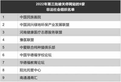 近日,民政部、中央網(wǎng)信辦、工業(yè)和信息化部持續(xù)深入落實中央關(guān)于打擊整治非法社會組織決策部署,精準(zhǔn)發(fā)力,有效打擊,依法關(guān)停了2022年第三批9家非法社會組織網(wǎng)站及相關(guān)新媒體賬號,清除了有關(guān)關(guān)聯(lián)網(wǎng)頁。 自2021年3月20日進一步打擊整治非法社會組織專項行動開展以來,,依據(jù)《中華人民共和國網(wǎng)絡(luò)安全法》《互聯(lián)網(wǎng)信息服務(wù)管理辦法》等有關(guān)法律法規(guī),對已取締的非法社會組織網(wǎng)站進行排查,至今已分十批次關(guān)停了110家處于存續(xù)狀態(tài)的非法社會組織網(wǎng)站及微信、微博等新媒體賬號,進一步夯實了線下打擊整治成果,鞏固了線上線下治理閉環(huán)。 此次關(guān)停操作涉及中國民族畫院、中國潤興綠地環(huán)保產(chǎn)業(yè)發(fā)展聯(lián)盟、中愛聯(lián)合純種貓俱樂部、河南健康醫(yī)療志愿服務(wù)聯(lián)盟等9家已被取締的非法社會組織。 民政部將持續(xù)保持打擊整治高壓態(tài)勢,加強網(wǎng)絡(luò)監(jiān)測與排查,線上線下同步查處,堅決鏟除非法社會組織的滋生土壤。對于性質(zhì)惡劣、屢教不改的非法社會組織發(fā)起人,還將提請工信部門依法納入違法互聯(lián)網(wǎng)站(主辦者)黑名單。歡迎社會各界登錄中國社會組織政務(wù)服務(wù)平臺,通過“投訴舉報”欄目,提供涉嫌非法社會組織活動信息、主要負責(zé)人及骨干人員的線索信息。 再次提醒有關(guān)機構(gòu)和社會公眾,在與社會組織開展合作或者參與其活動時,務(wù)必注意核查其身份。全國社會組織的登記信息可通過中國社會組織政務(wù)服務(wù)平臺、中國社會組織動態(tài)政務(wù)微信(微信號:chinanpogov)等渠道在線查詢。 (據(jù)民政部官網(wǎng)) |