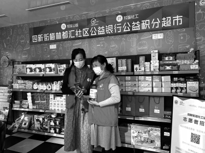 2022年4月16日,志愿者在漢陽(yáng)區(qū)四新街道梅林都匯社區(qū)“公益積分超市”兌換生活用品,社工則在“公益銀行微信小程序”上掃碼核銷