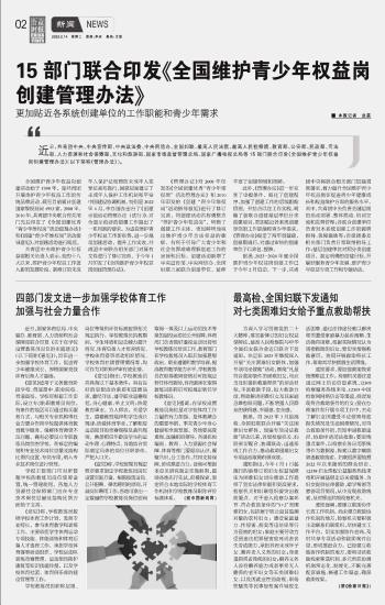15部門聯(lián)合印發(fā)《全國(guó)維護(hù)青少年權(quán)益崗創(chuàng)建管理辦法》