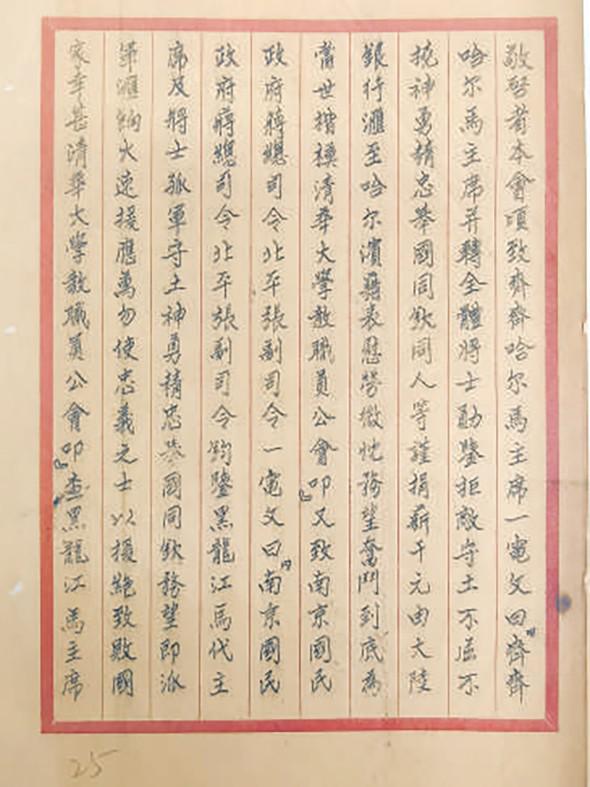1931年,日本悍然發(fā)動九一八事變,中國人民不屈不撓的局部抗戰(zhàn),揭開了世界反法西斯戰(zhàn)爭的序幕。作為中國武裝抗日的“第一槍”,江橋抗戰(zhàn)宛如一聲驚雷,在白山黑水間激民族之義憤,燃滿腔之熱血。北平各界同仇敵愾,通過聲援、募捐等方式,表達對抗日志士的支持和守土衛(wèi)國的決心。 臨危受命江橋迎戰(zhàn)關(guān)東軍 初夏的清華園,萬物蔥蘢、水木禽鳴,荷塘漣漪一圈圈蕩開。禮堂前,“行勝于言”的石刻在陽光下熠熠生輝。 正值周末,入校游學的青少年絡(luò)繹不絕,在標志美景前競相留影。風華正茂的學子騎著車經(jīng)過,衣角飄動,聚焦了人們欽羨的目光。 近百年前,以清華為代表的北平高校師生,同樣以實際行動,成為全民抗戰(zhàn)意識的引領(lǐng)者,正是“行勝于言”的無聲寫照。 1931年,九一八事變爆發(fā)后,日本侵略軍一周內(nèi)相繼侵占遼、吉兩省主要城市,并圖謀進犯黑龍江省。黑河警備司令兼步兵第3旅旅長馬占山臨危受命,主持黑龍江軍政。 “馬占山在嫩江北岸至昂昂溪之間,構(gòu)筑了三道防線。11月3日,日軍兩列鐵甲車開赴嫩江橋,日軍飛機向中國軍隊投擲炸彈。”北京市檔案館展陳處副處長劉靜的講述,令人感受到當時戰(zhàn)況之激烈?!皷|北氣溫已低至嚴寒,馬占山率領(lǐng)愛國官兵,以落后的武器、簡陋的裝備,迎戰(zhàn)擁有飛機、大炮、坦克的日本關(guān)東軍,喊殺聲、刺刀撞擊聲震蕩山野……半個月的時間,抵擋了日軍一波接一波的攻擊?!?br> “男兒抗日死沙場,青史垂名姓字香?!苯瓨蚩箲?zhàn)的消息傳到北平后,愛國學子熱血沸騰,紛紛請纓要求北上抗日。與此同時,北平各界慷慨解囊,為抗日將士募集善款。其中清華大學發(fā)揮了先鋒作用,該校教職員公會對日委員會捐薪千元,緊接著,由學生自治會迅速組織全校募捐活動。 慷慨解囊為將士募集善款 不僅自發(fā)籌措善款,清華大學教職員公會對日委員會還發(fā)函致北平大學工學院,邀對方對馬占山進行一致聲援。 很快,北平大學工學院也發(fā)出募捐慰勞馬占山及諸將士的啟事。劉靜展開這份1931年11月27日的史料,其上載明“當此雪地冰天,前方愛國將士斷頭折臂,努力為國家爭存亡之際,吾輩身在后方,未能先期赴國難,自當各盡職責,以表救國之意……”字里行間,盡顯高校青年的報國情懷。 學界之外,各界群眾也自發(fā)組織慰問團、后援會,捐款捐物,全力支持。劉靜介紹,例如東北民眾救國會,爭取張學良以及國內(nèi)各界人士、海外僑胞的資助,開展募捐和“義賣”,發(fā)行“愛國獎券”等,給黑龍江軍民以極大的支持。 一封封書信、電報,記錄下這段波瀾壯闊的歷史。1932年1月4日的《國立清華大學??飞?,登載馬占山將軍給清華大學的復電,稱:“承惠巨款,益勵初衷。謹率部曲遙致謝忱?!倍盏狡浇?qū)W術(shù)團體對日聯(lián)合會發(fā)來的電報后,馬占山更回復,“占山忝屬軍人,尤其責無旁貸,茍一息之尚存,豈慮孤軍之苦戰(zhàn)?!辩H鏘有力的表達,書就這位民族英雄的氣節(jié)風骨,也掀開軍民同仇敵愾,保家衛(wèi)國的篇章。 奔走宣傳直面“最殘酷時代” 江橋抗戰(zhàn)的壯舉震動海內(nèi)外,除捐款捐物,北平各界還廣泛發(fā)起宣傳活動。其中北平師范大學(現(xiàn)北京師范大學前身)師生表現(xiàn)活躍,組織了國立北平師范大學教職員對日外交后援會(后改稱平津?qū)W術(shù)團體對日聯(lián)合會師大分會)、北平師范大學抗日救國會等團體,分析抗戰(zhàn)形勢,揭露日本暴行。 如今的北京師范大學,地處車水馬龍的北三環(huán)旁,徜徉校園,傍晚的風攜來芬芳花香,耳畔蕩起廣播悠揚的樂曲。正是拍攝畢業(yè)照的時節(jié),意氣風發(fā)的年輕人三三兩兩,在古色古香的教學樓、京師學堂、校訓石碑前,定格下青春的光影。 當年,也是這樣年紀相仿的學子們,心懷大義,為民族存亡奔走呼號。據(jù)北師大校史研究室提供的資料,1931年10月26日,該校學生抗日救國會宣傳隊,曾赴長辛店機車廠演講抗日救國,并散發(fā)《為日本帝國主義占領(lǐng)東三省告工友書》。 此外,北平師范大學抗日救國會還創(chuàng)辦了《抗日周刊》,北京市檔案館所藏第二期,出版于1931年11月2日。末尾征稿啟事疾呼:人類最殘酷的時代已經(jīng)降臨到我們面前了!這種“殘酷”“無理性”“暴戾”,逼迫著我們不得不負起這種重大的使命去奮斗,去拼命,去推倒一切的人壓迫人的禽獸行為!并號召同學們努力投稿,“戰(zhàn)勝一切的障礙,充實抗日的內(nèi)容。” 劉靜介紹,北平各界的全力支持,給了馬占山將軍抗戰(zhàn)到底的動力?!敖瓨蚩箲?zhàn)更喚起中華民族的空前覺醒,作為中國人民抗日斗爭的序曲,永載史冊?!?br> ?。〒?jù)《北京晚報》) |