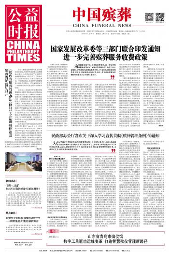 《公益時(shí)報(bào)》中國(guó)殯葬專(zhuān)刊隸屬于《公益時(shí)報(bào)》社,是由民政部主管的國(guó)內(nèi)第一份全國(guó)性殯葬行業(yè)報(bào)紙,前身是中國(guó)殯葬報(bào),始創(chuàng)于1991年;目前每周發(fā)行1期,每期8版。