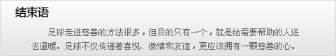 喀麥隆球星埃托奧是聯(lián)合國兒童基金會(UNICEF)的形象代言人,UNICEF作為聯(lián)合國系統(tǒng)唯一致力于兒童發(fā)展的組織,為發(fā)展中國家兒童在基礎保健、營養(yǎng)、基礎教育和安全飲用水方面提供援助,埃托奧的非洲背景和個人影響力,讓他十分適合擔任這一組織的代言人。 |