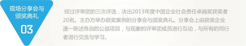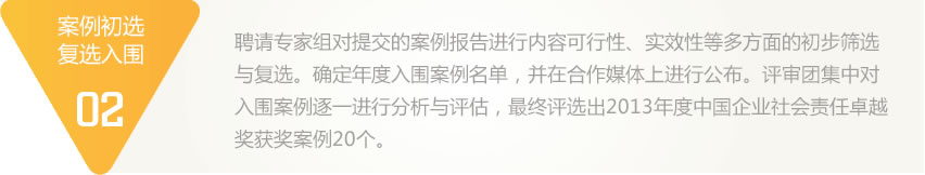 中國企業(yè)社會(huì)責(zé)任卓越獎(jiǎng),將通過“企業(yè)案例報(bào)名征集” “案例初選、復(fù)選入圍” “獲獎(jiǎng)案例分享頒獎(jiǎng)典禮”的流程,公開、公正、公平的推選出年度卓越案例。
